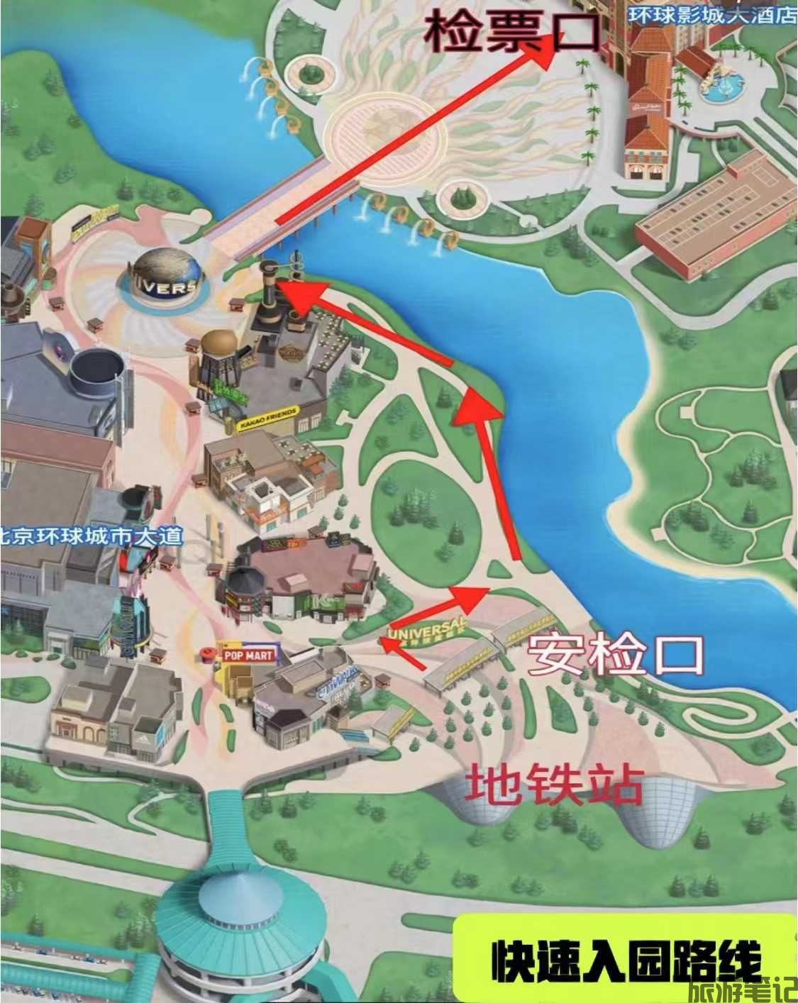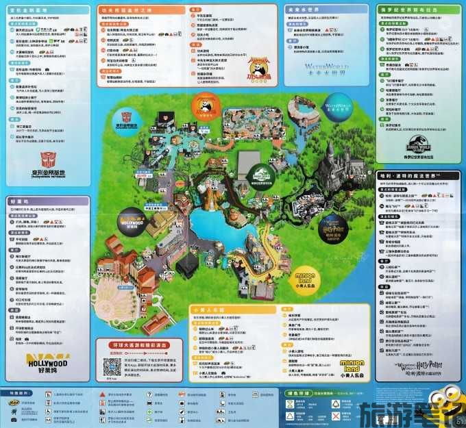 - 捷进路线:①进园后右转经小黄人区直达哈利・波特园区(9:30 后可用);②左转至假山处右转直达侏罗纪园区