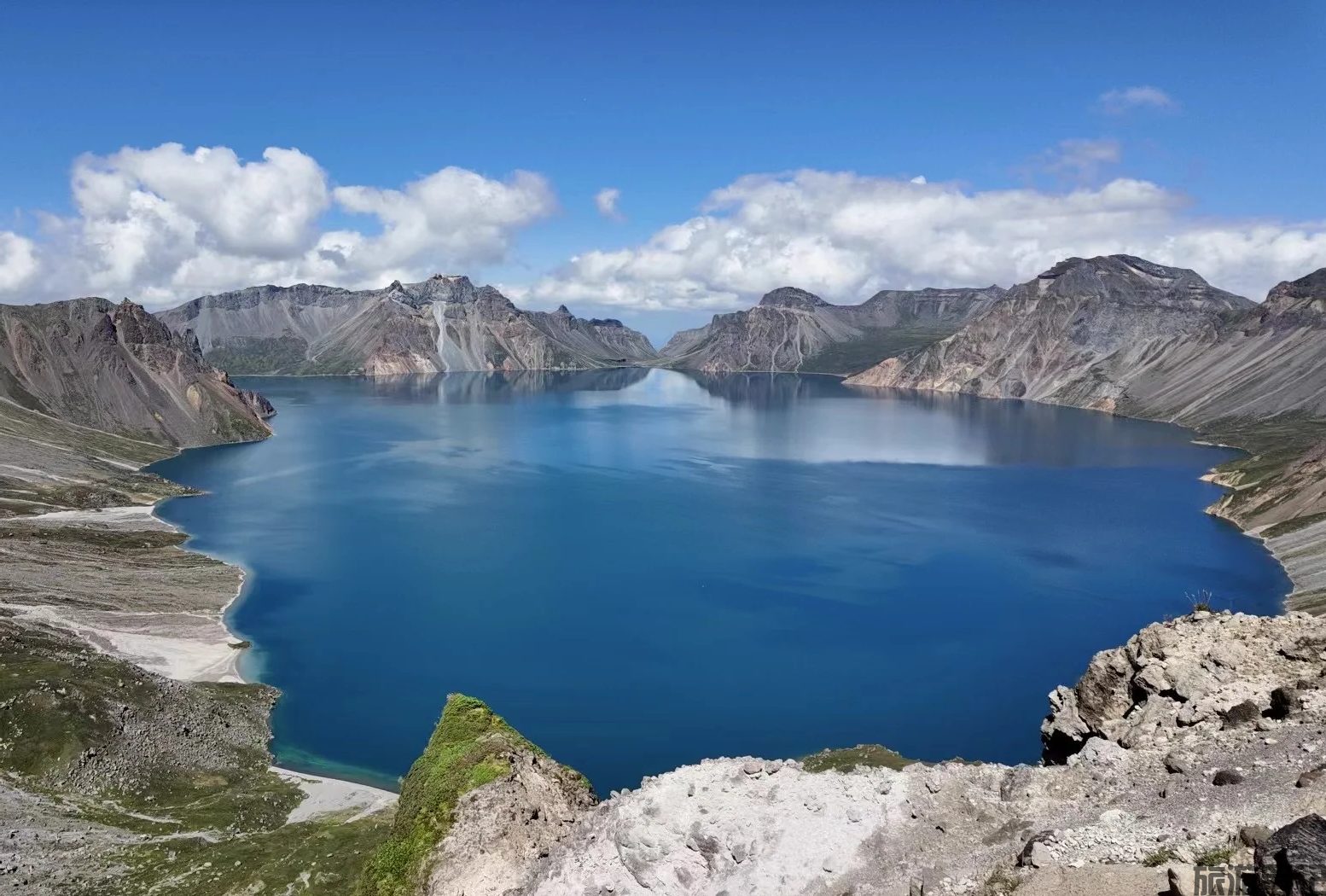 越走越近,完整的天池终于呈现在我们的眼前。天气堪称完美,天池是那么的透净明亮!在阳光的照射下,部分池水由蓝变绿,在周边火山🌋灰的映衬下,显得更加明媚。空中飘动的云雾,时而半遮掩着,时而揭开面纱,仙气飘飘,给美丽的天池又增添了一份灵气。此情此景真是让人心旷神怡!看来一周的关闭,天池也迫不及待以最好的姿态迎接期待已久的白山粉们!
